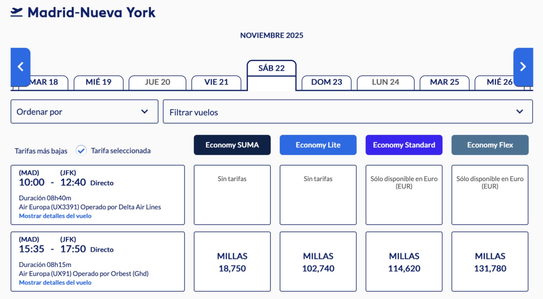 Y otra entre España y Nueva York, que normalmente cuesta 25.000 y se pueden encontrar por 18.750