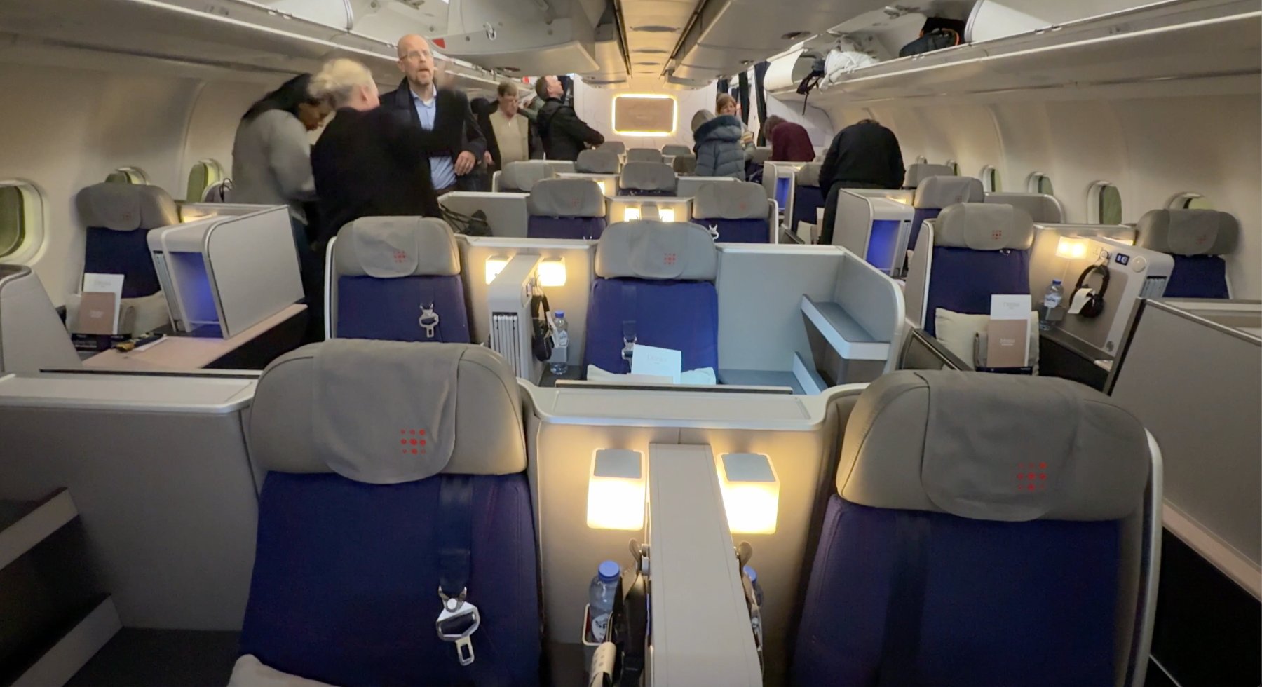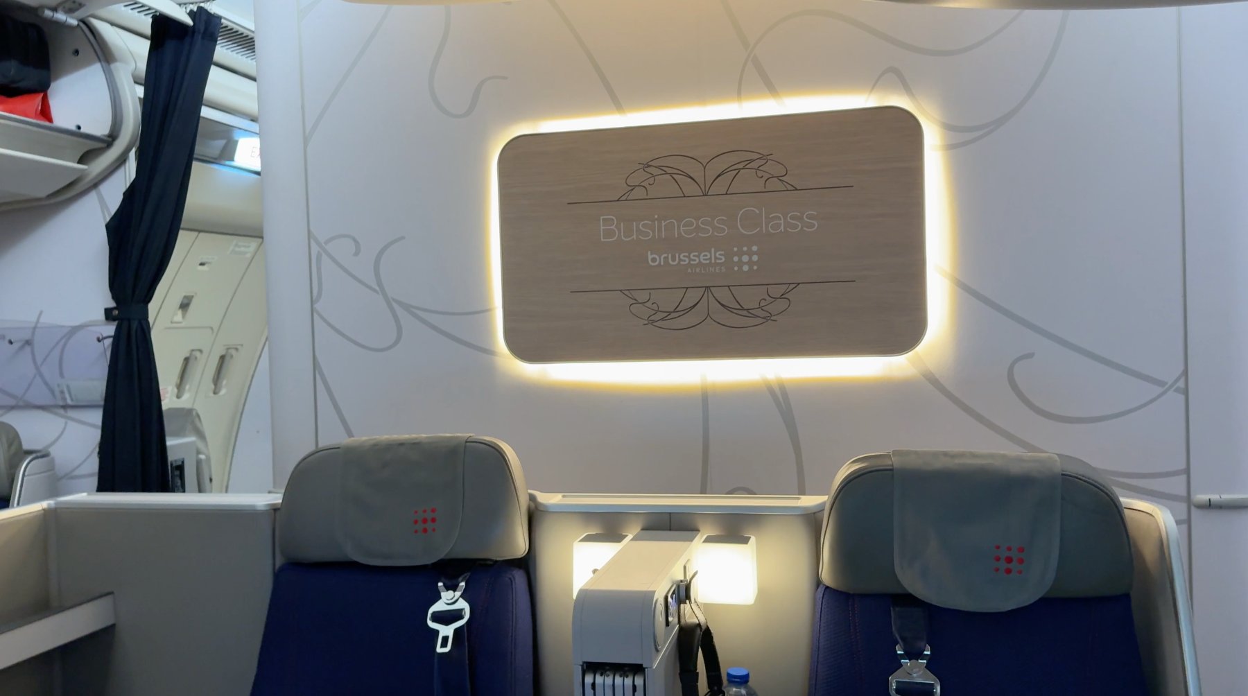 Brussels tiene 3 tipos de configuraciones en sus A330. Esta concretamente tiene solo 3 asientos «Trono» de los 30 de la cabina.