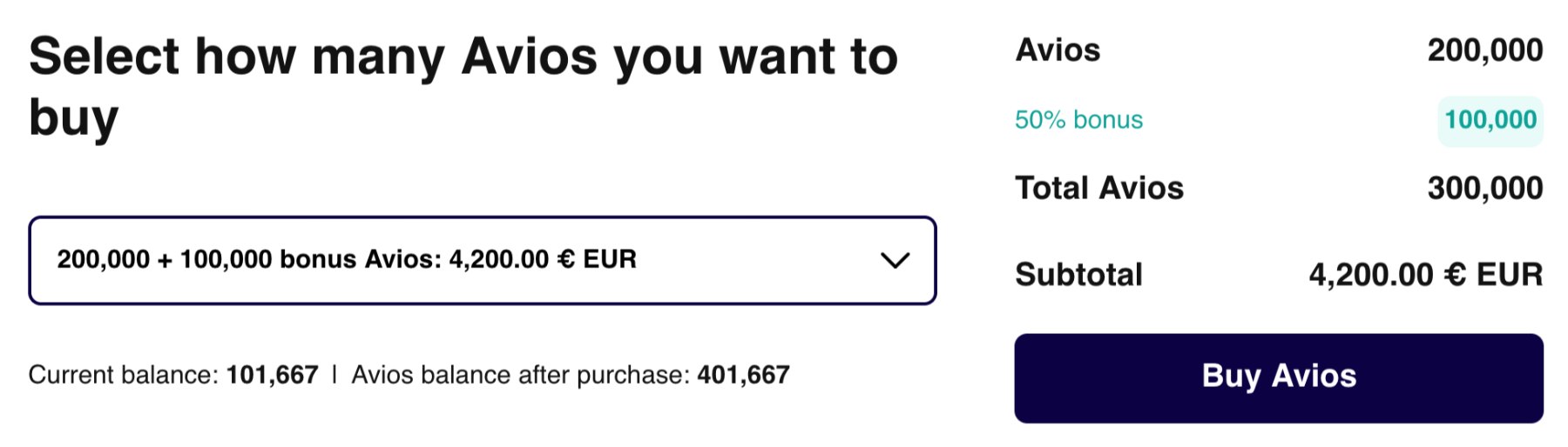 Optimizando la oferta, comprando el máximo de 200.000 Avios a través de esta promoción recibirás un total de 300.000 Avios por 4200€