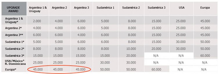 Un upgrade a business con millas del programa Aerolíneas Plus cuesta 45.000 millas por tramo a Europa, así que podría decirse que la relación entre ambos precios mantiene cierta lógica.