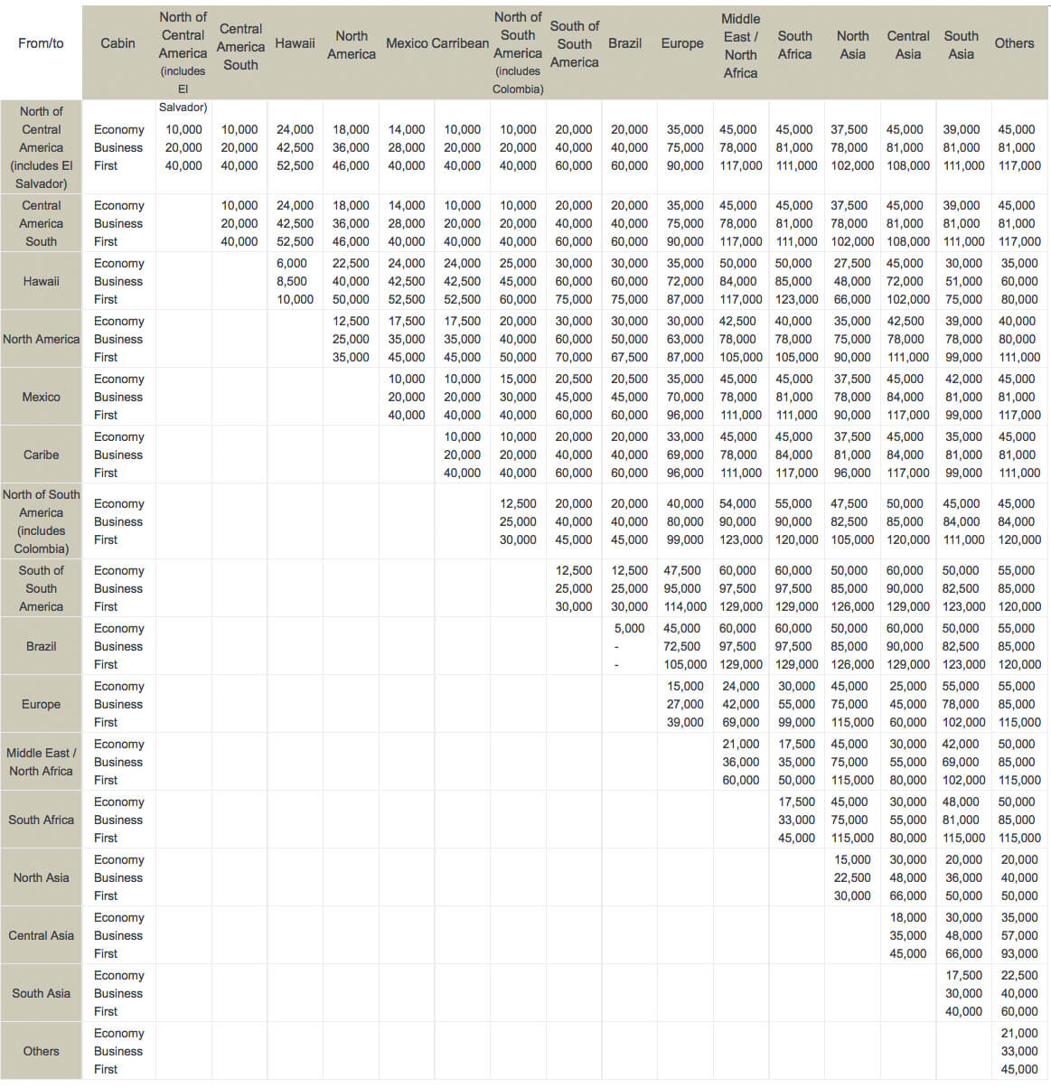 Lifemiles tiene un chart razonable para redenciones, y las tasas no son excesivas. Las que a mi más me gustan, personalmente, son aquellas entre sudamérica y Estados Unidos por 70.000 en primera clase (lamentablemente en United), y aquellas entre Europa a Asia Central por 45.000 en clase ejecutiva y 60.000 en primera.